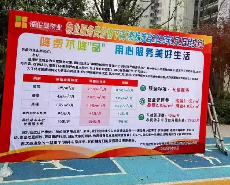 天府新区海伦堡玖悦府小区,近期公布物业降费的通知。内容显示从2026年1月1日起,高层住宅从原来3元/m²/月调至2.1元/m²/月,车位管理更是从每月80元腰斩到40元。